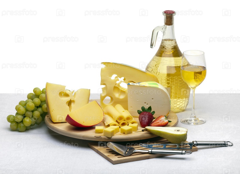 Сыр разных сортов на деревянном блюде, виноград и бутылка вина на белом фоне