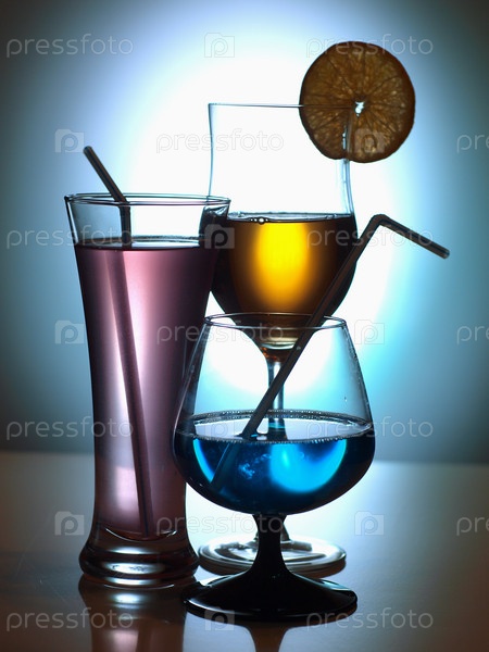 Три разных коктейля на голубом фоне