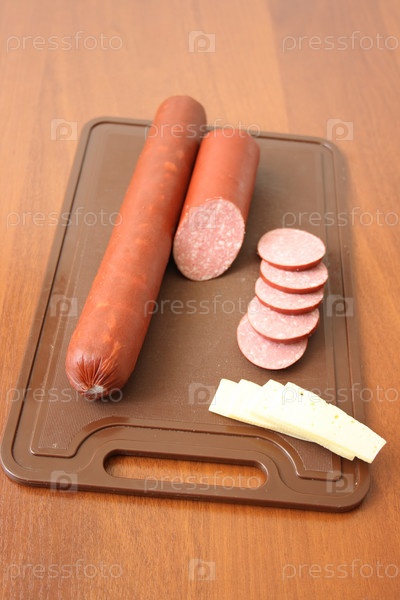 Нарезанный сыр и колбаса на доске