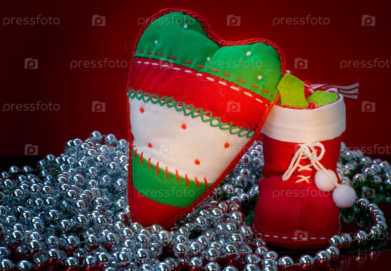 Рождественские украшения с бусами на красном фоне