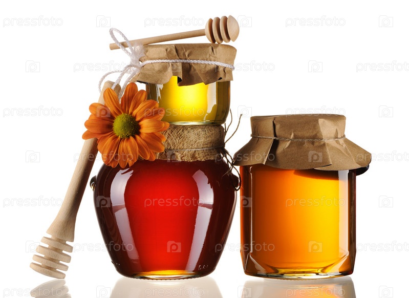 Банки с медом на белом фоне