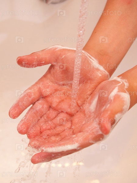 Намыленные детские руки под струей воды