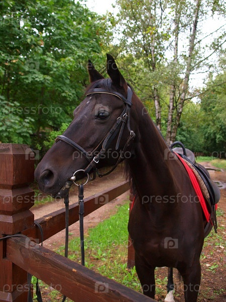 Вороной конь привязан к изгороди