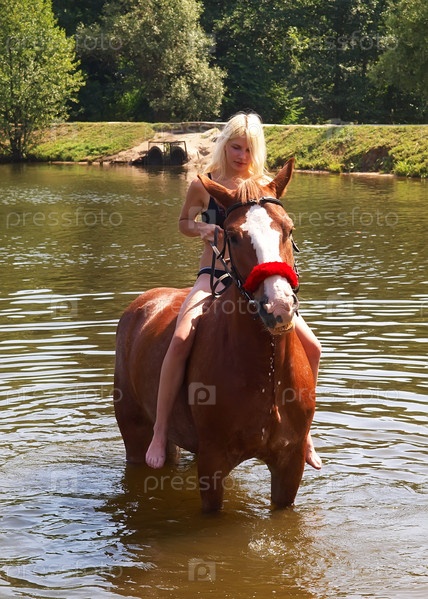 Девушка и конь купаются в пруду