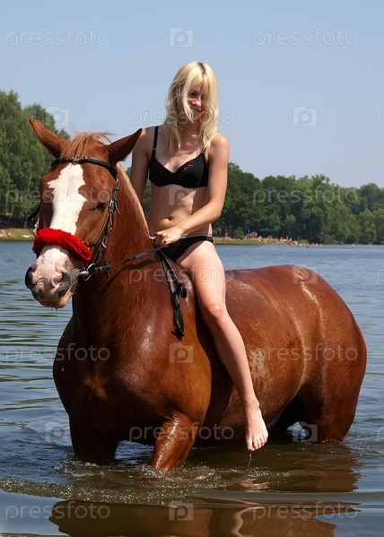 Девушка и конь купаются в пруду