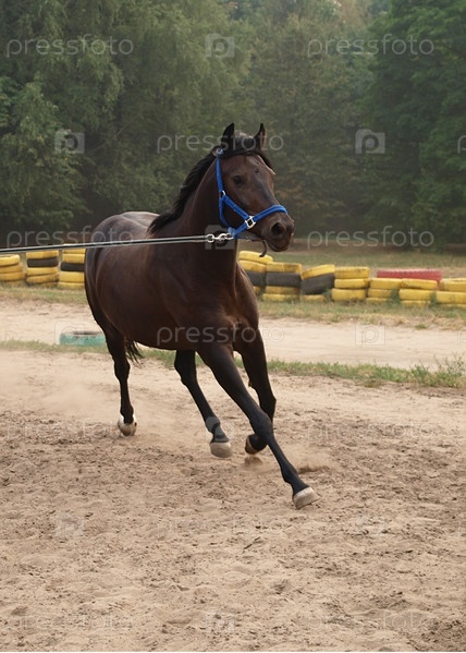 Вороной конь бежит по кругу рысью