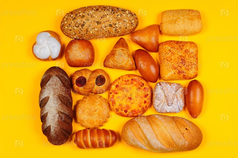 Различные булочки и хлеб на желтом фоне
