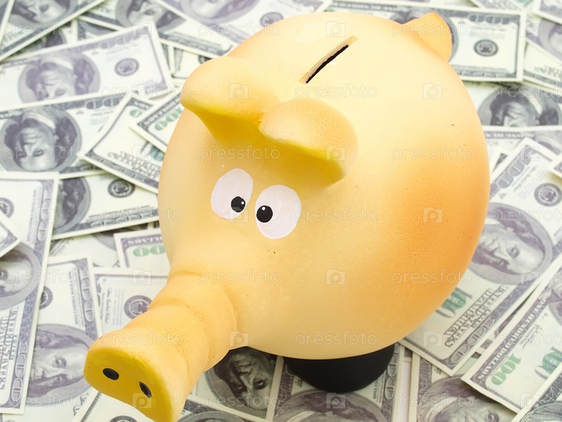 Копилка-свинка на фоне купюр.