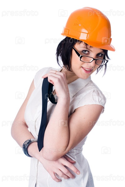 Портрет молодой девушки в защитном шлеме, на белом фоне