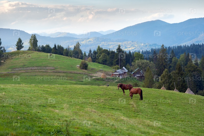 Две лошади на пастбище и сельские дома в Карпатских горах, Украина