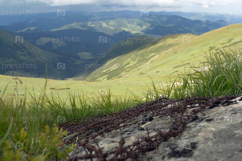 Колючая проволока на камне в Карпатских горах. Остатки оборонительной линии со времен Первой мировой войны