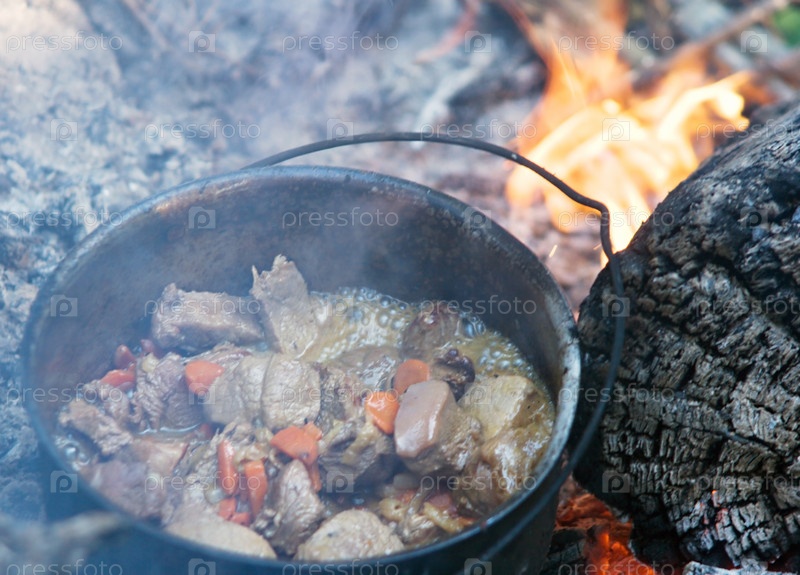 Походный котелок с тушеным мясом на костре