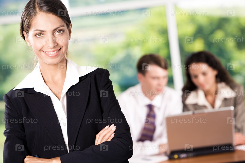 Портрет счастливой женщины в костюме, смотрящей на камеру с улыбкой в рабочей среде
