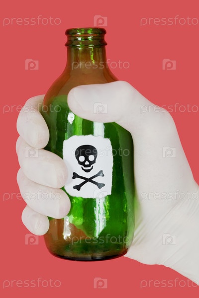 Зеленая бутылка с черепом и крестовыми костями в руке