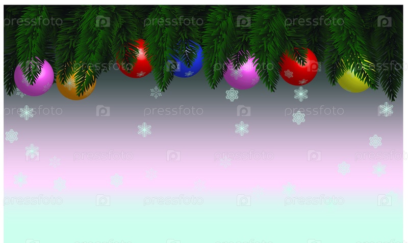 Пустой новогодний фон с местом для текста, елочными игрушками и ветками ели, свисающими сверху