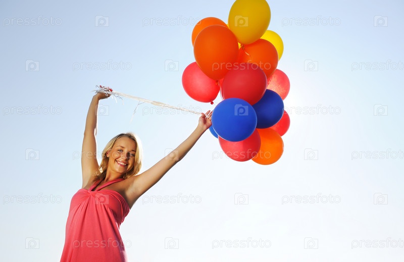 Блондинка в розовом платье с воздушными шарами в руках на фоне неба