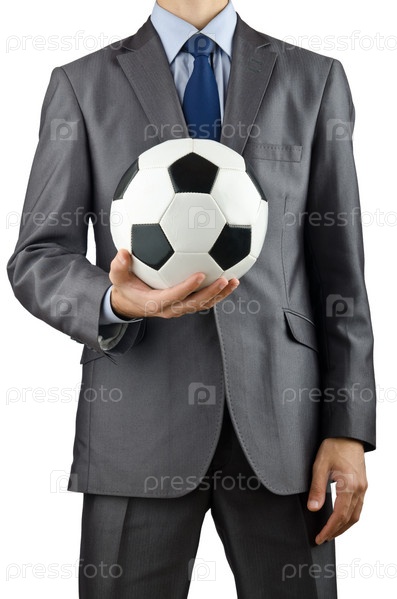 Бизнесмен с футбольным мячом на белом фоне