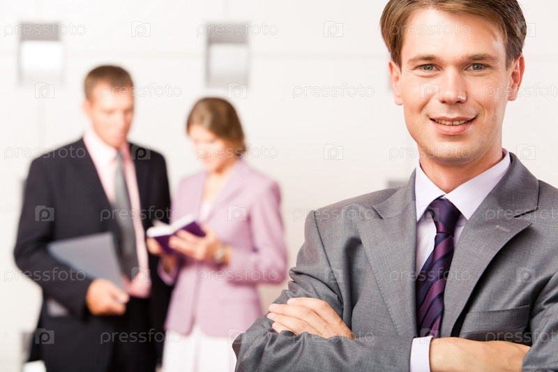 Портрет улыбающегося бизнесмена, скрестившего руки на фоне людей