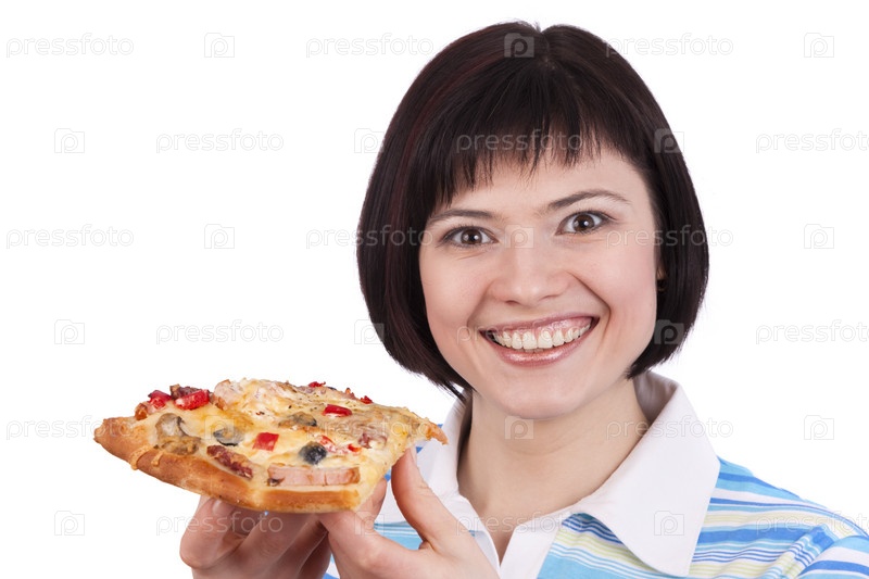 Молодая счастливая женщина ест пиццу, изолированную на белом фоне. портрет молодой женщины с куском пиццы в руках