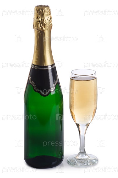 Бутылка шампанского и бокал, изолированные на белом фоне