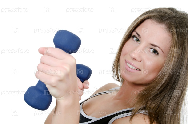 Девушка с гантелями, изолированная на белом фоне