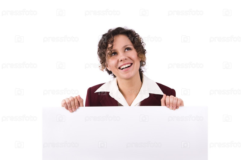 Портрет счастливой бизнес-жены, держащей белую пустую карточку на изолированном белом фоне. Красивая молодая женщина держит в руках белый знак. Деловая женщина стоит рядом с рекламным щитом