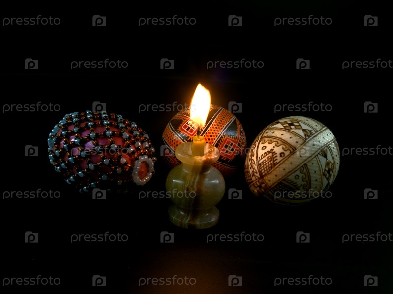 Красивые пасхальные яйца и свеча в темноте