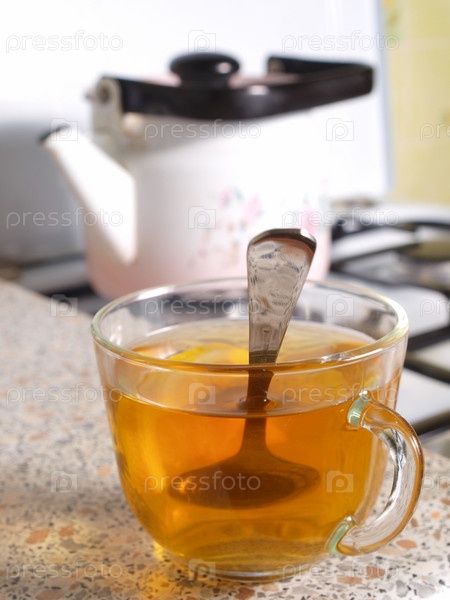 Кружка чая с ложкой на фоне чайника