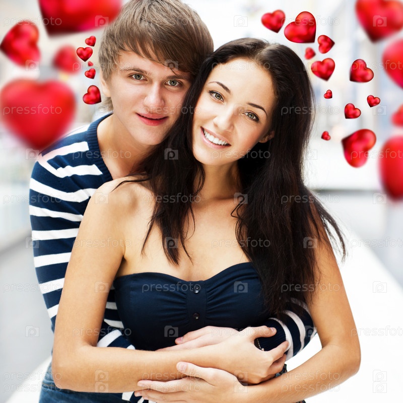 Макрофотография молодй пары, обнимающейся и очень радующейся быть вместе. Концепциик дню Св.Валентина. Красные сердца летают вокруг них