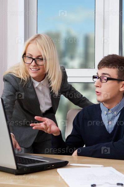 Молодые успешные деловые люди улыбаются и работают в офисе