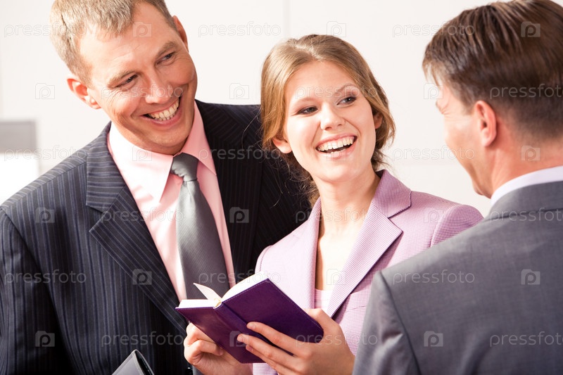 Счастливая женщина стоит между двумя бизнесменами и смотрит на одного из них, смеясь