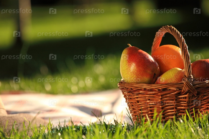 Корзина с фруктами на траве в летнем парке