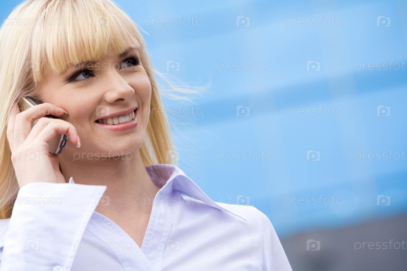 Портрет красивой блондинки, разговаривающей по мобильному телефону на синем фоне