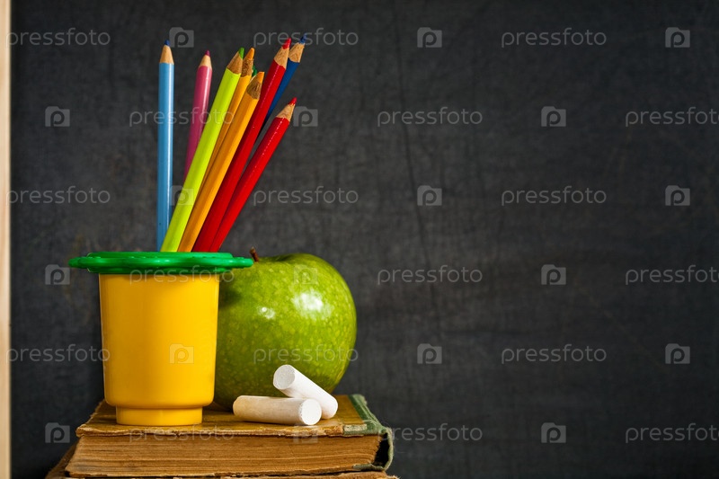 Старые книги, мел, яблоко и карандаши на черном фоне