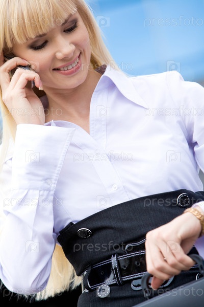 Портрет современной деловой женщины, смотрящей на часы во время разговора по телефону
