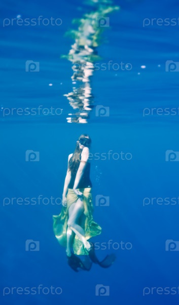 Девушка в желтой юбке и ее отражение на поверхности моря, подводный вид