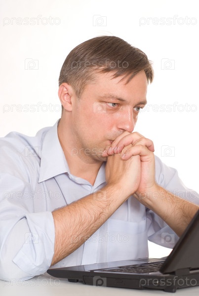 Молодой бизнесмен с ноутбуком на белом фоне