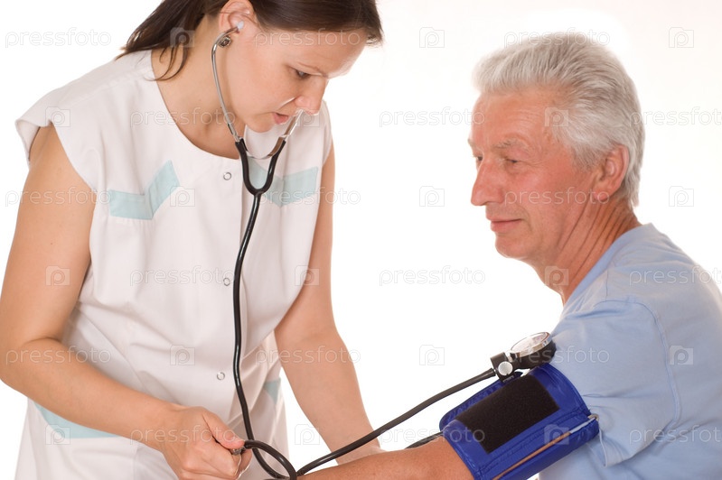 Молодая женщина-врач измеряет давление пожилому мужчине