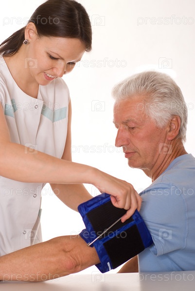 Молодая женщина-врач измеряет давление пожилому мужчине
