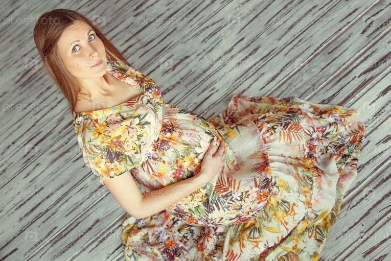 Беременная женщина в платье сидит на полу