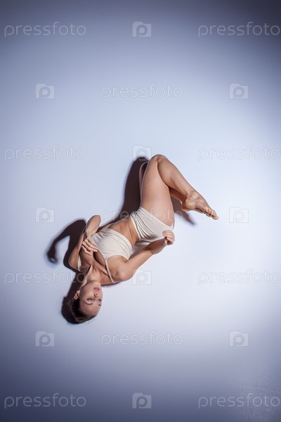 Молодая красивая танцовщица в бежевый Купальники, танцы на сиреневый фон