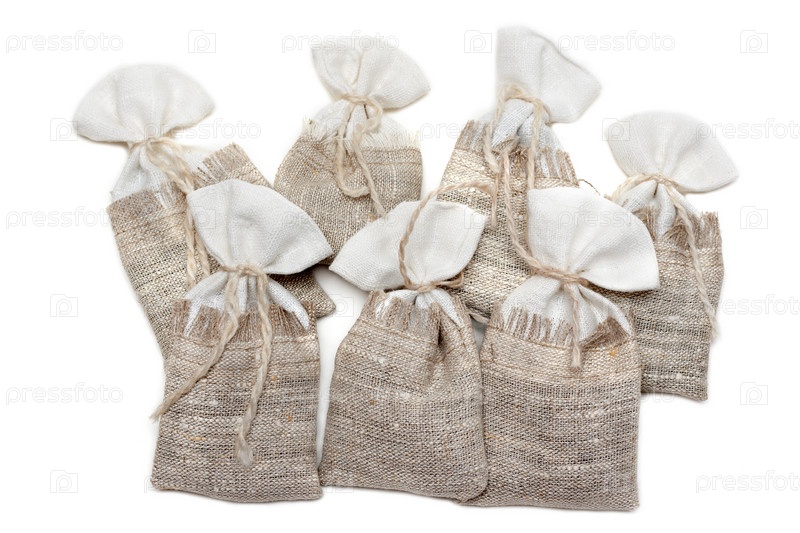 Сумка, пронизанная пряностями и связанной веревкой на белом фоне
