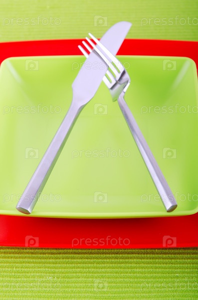 Пустая тарелка, вилка и нож на столе