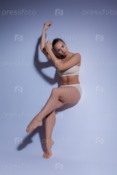 Молодая красивая танцовщица в бежевый Купальники, танцы на сиреневый фон