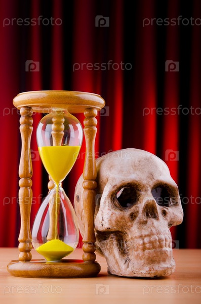 Песочные часы и череп на столе, концепция времени и смерти