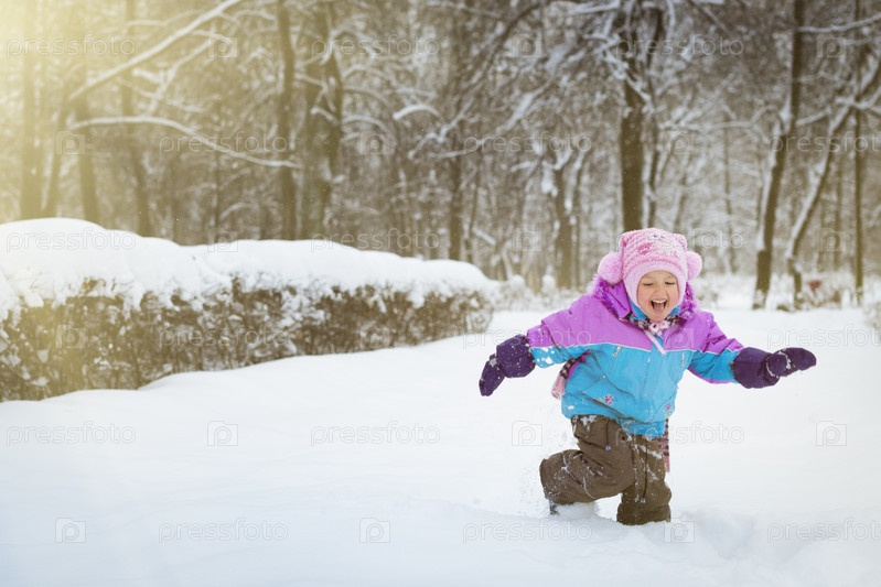 Веселая девочка, играя с снега зимой снежный парк, Красное село, Санкт-Петербург, Россия