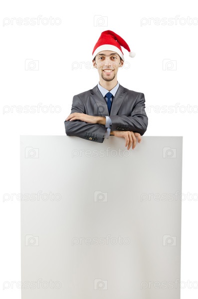 Молодой бизнесмен в шапке Санта-Клауса и шаблоном для текста