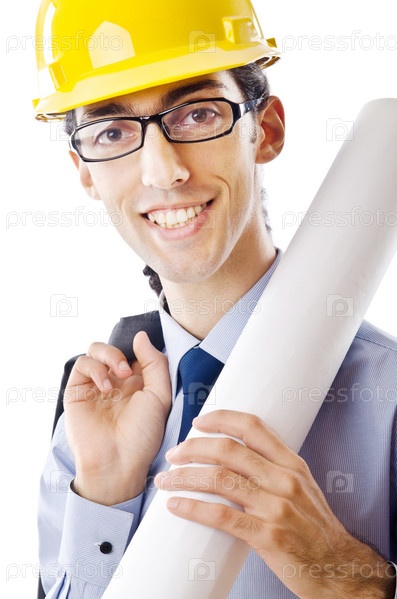 Молодой архитектор с чертежами, изолированный на белом