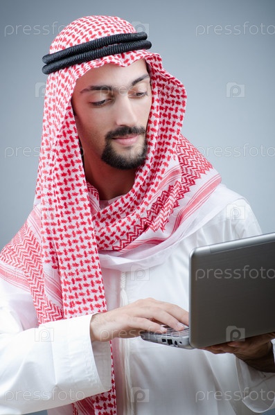 Молодой араб с ноутбуком, изолированный на белом фоне