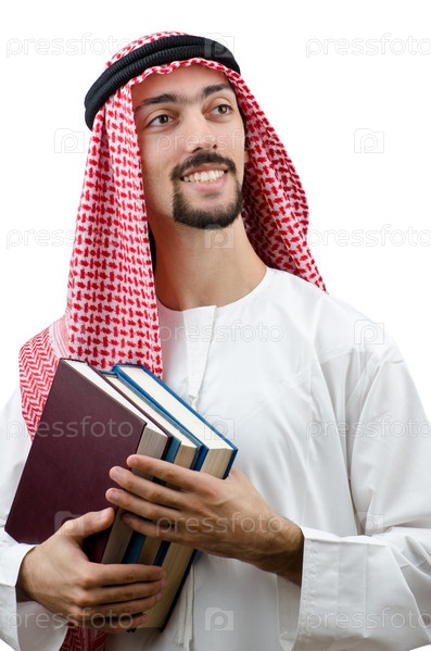 Молодой араб с книгами, изолированный на белом фоне